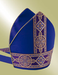 Custom Mitres of this style are available with delivery in 6 to 8 weeks in your choice of sizes, fabrics, etc. (MR124). Please contact us for more information at 732-714-7796.